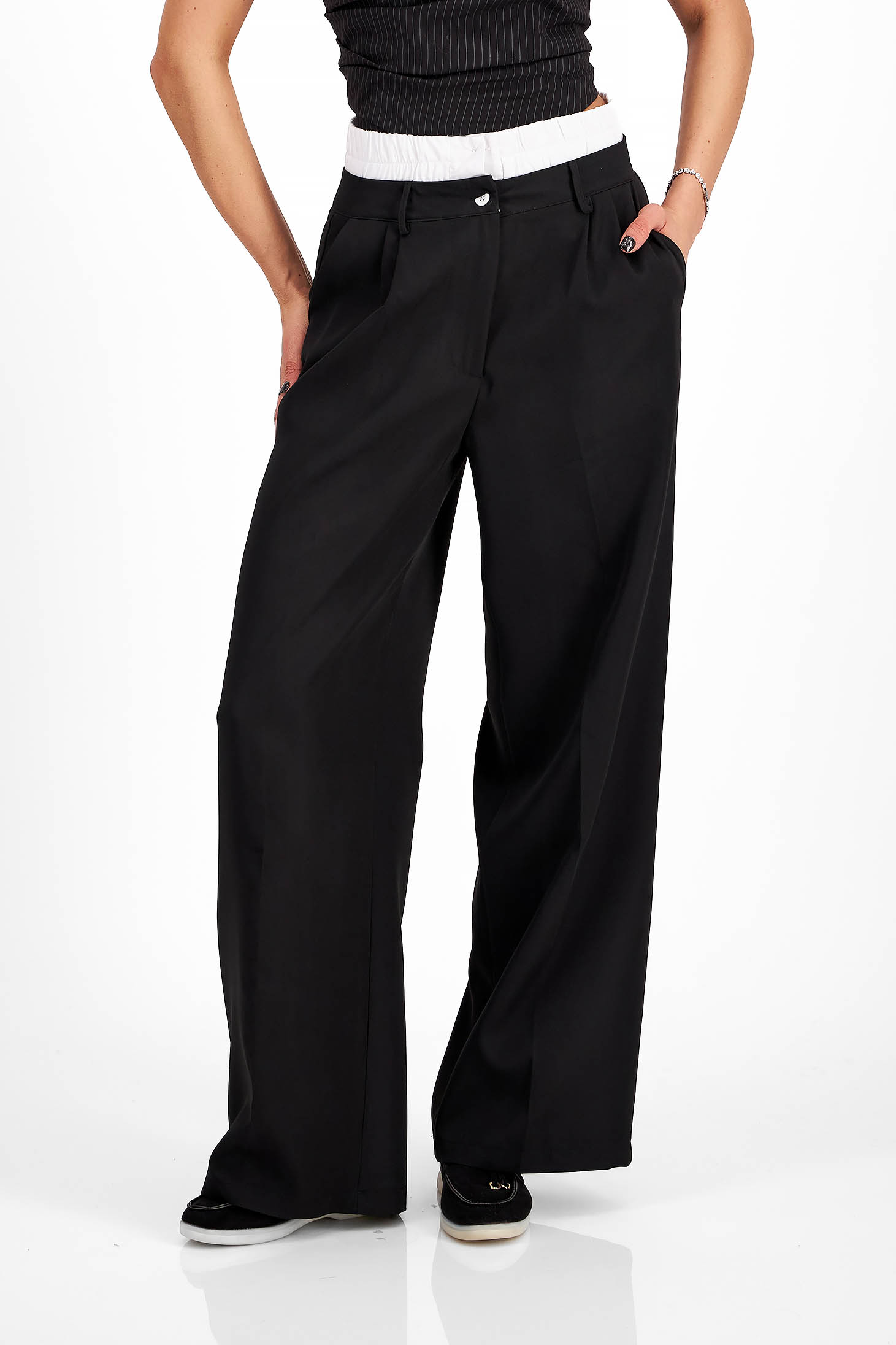 Nagy fokú zavarossággal és lendülettel rendelkező fekete bő szövetből készült szűk nadrágok.A szabás magasan derékszabású.