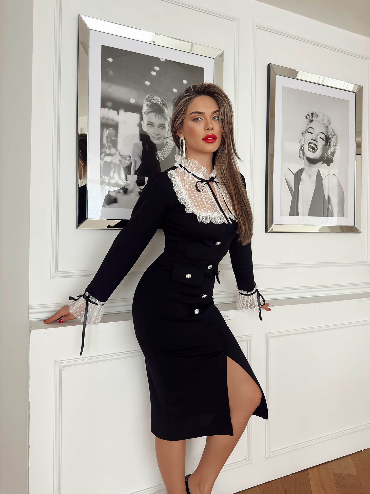 Az ujjvégek és a gallér tüllből készültek pöttyökkel díszítve fekete szalaggal.