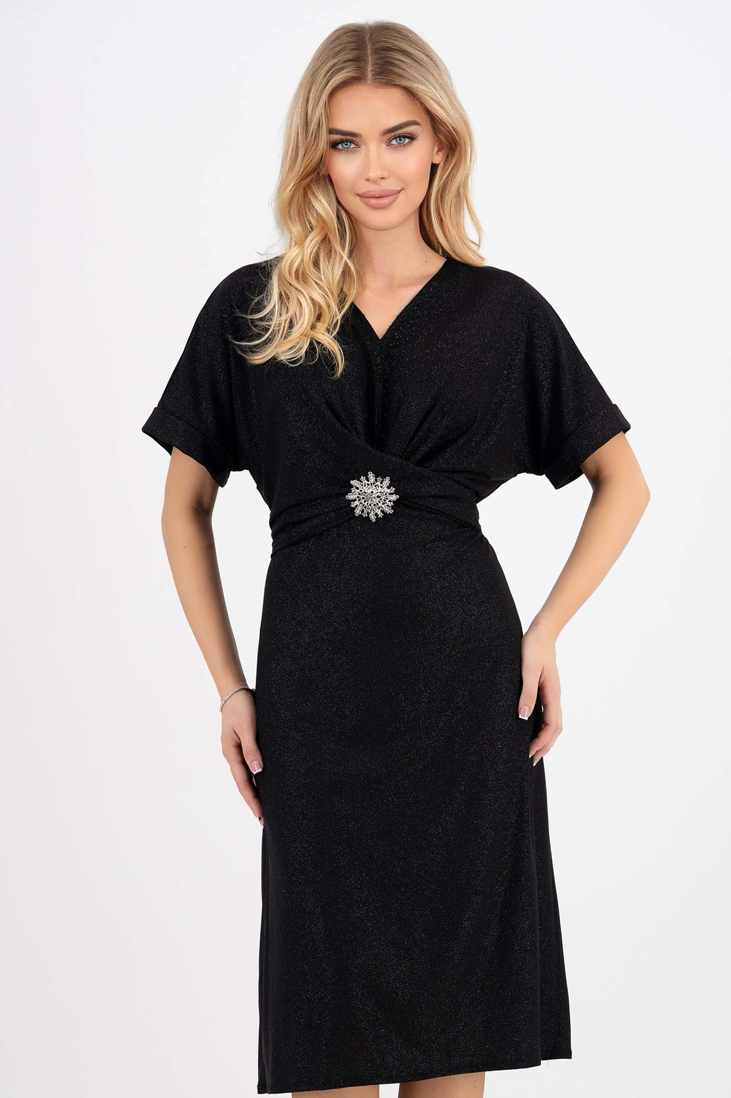 Fekete lycra ruha csillámos applikációkkal. A fazon laza, tunikastílusú a felső részen húzózárral. A ujjak rövidek. A dekoltázs V-alakú. Bélés van belül. Nincs záródó rendszer.Strasszköves brossal van díszítve a derekán.