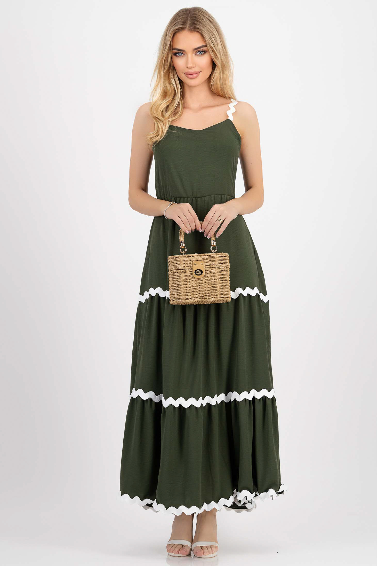 Khaki zöld vékony ruha, harang alakú gumirozott derékrésszel