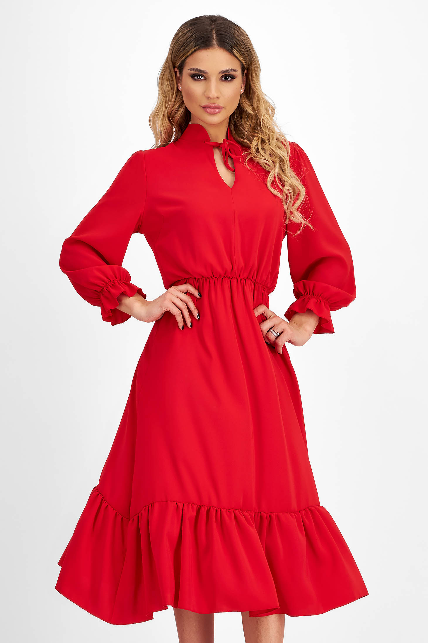 Piros georgette midi ruha, harang alakú gumirozott derékrésszel, StarShinerS