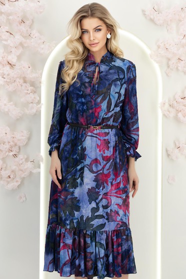 Sötétkék viszkóz ruha, midi hosszúságú, bő szabású, gumis derékrésszel és fodros ujjakkal - StarShinerS