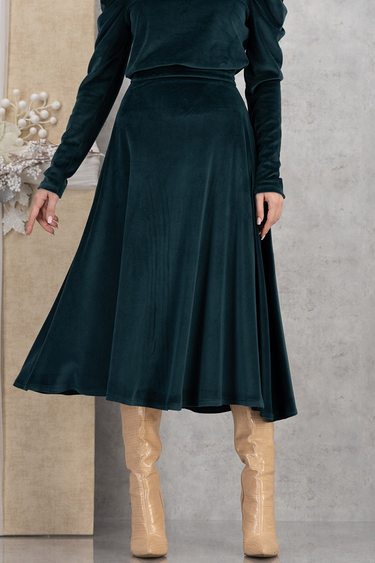 Elegáns szoknya közepes sűrűségű bársonyból, rendkívül puha és kellemes tapintású anyagból. Az A-vonalú szabás és a magasított derék nőies, kifinomult sziluettet alkot, tökéletes különleges alkalmakra vagy elegáns öltözékhez. A szoknya nincs béléselve, így megőrzi könnyedségét, a záródás pedig diszkrét, rövid rejtett cipzárral történik a hátrészen. Sokoldalú és kifinomult darab, amely stílust ad a gardróbodhoz.* A fényképen viselt méret: 36 (S) | Testmagasság: 170 cm